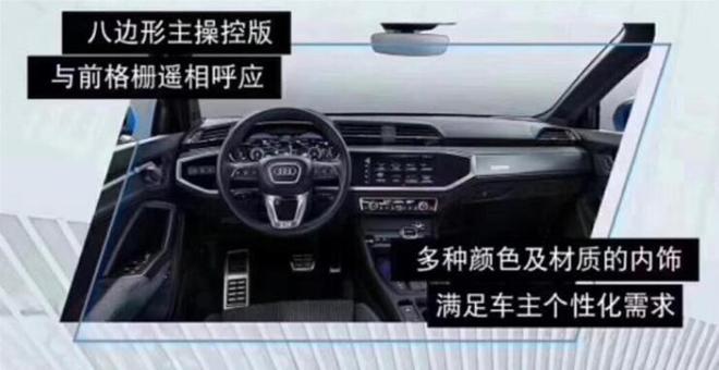内饰方面,国产奥迪Q3将采用与海外版车型相同的设计,全新的多边形中控台为奥迪最新的家族式设计,并提供多种不同材质的内饰面板。配置方面,新车将全系标配全液晶仪表和液晶中控屏,并按照不同配置分为10.25英寸仪表+8.8英寸中控屏和12.3英寸仪表+10.1英寸中控屏两种组合。